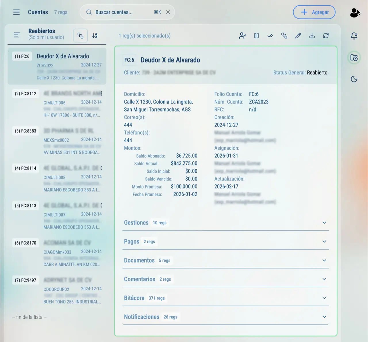 Vista de inicio con indicadores operativos para monitorear el desempeño del despacho. Muestra los indicadores clave de gestión, como número de casos activos, compromisos de pago próximos, tareas pendientes y alertas críticas. Permite al despacho tener una visión general rápida del estado de su operación y priorizar acciones desde el primer momento.
